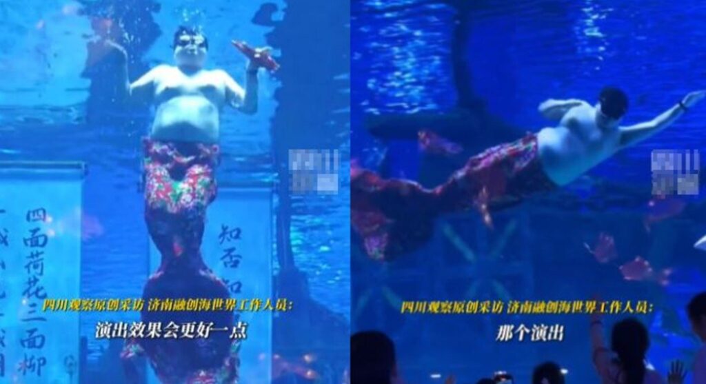 В китайском океанариуме вместо русалочки в аквариум запустили… пузатого уборщика. Эта необычная ситуация произошла из-за внезапной болезни актрисы, которая должна была исполнять роль загадочной морской нимфы. Организаторы, оказавшись в щекотливом положении и не желая отменять представление, приняли весьма нестандартное решение — нарядили в блестящий костюм русалки обычного работника океанариума, который обычно занимается поддержанием чистоты в подводных экспозициях.
